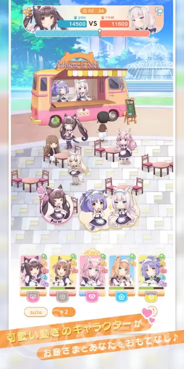 游戏战斗系统采用半自动模式,操作简单易上手,新手玩家也能快速掌握核心玩法。除了主线剧情推进,游戏还创新性地融入了沙盒经营元素——玩家需要与主角一同经营名为“La Soleil”的手工甜品店。这一玩法并非孤立存在,而是深度融入主线叙事:随着“猫咪节”邀请函发往全球,世界各地的猫娘们齐聚一堂,共同参与这场以甜品制作技艺与真挚情感联结为主题的温馨盛会。根据剧情设定,赛事优胜者还将解锁独特的AI许愿功能。此外,游戏实现了全剧情语音覆盖,包括主线及所有角色支线,配音演出完整且情感饱满,足见制作诚意。