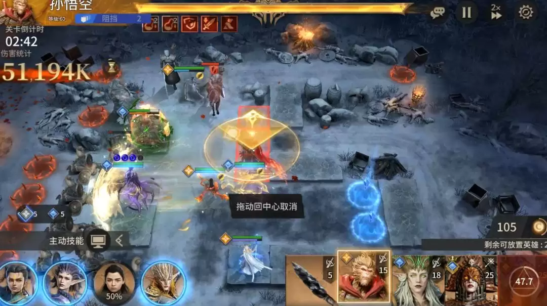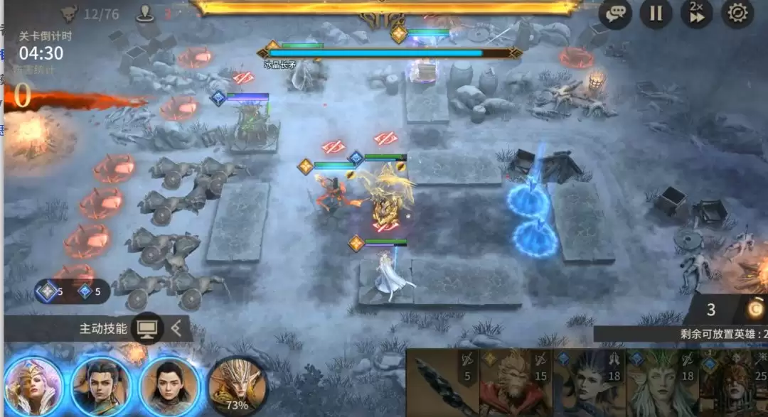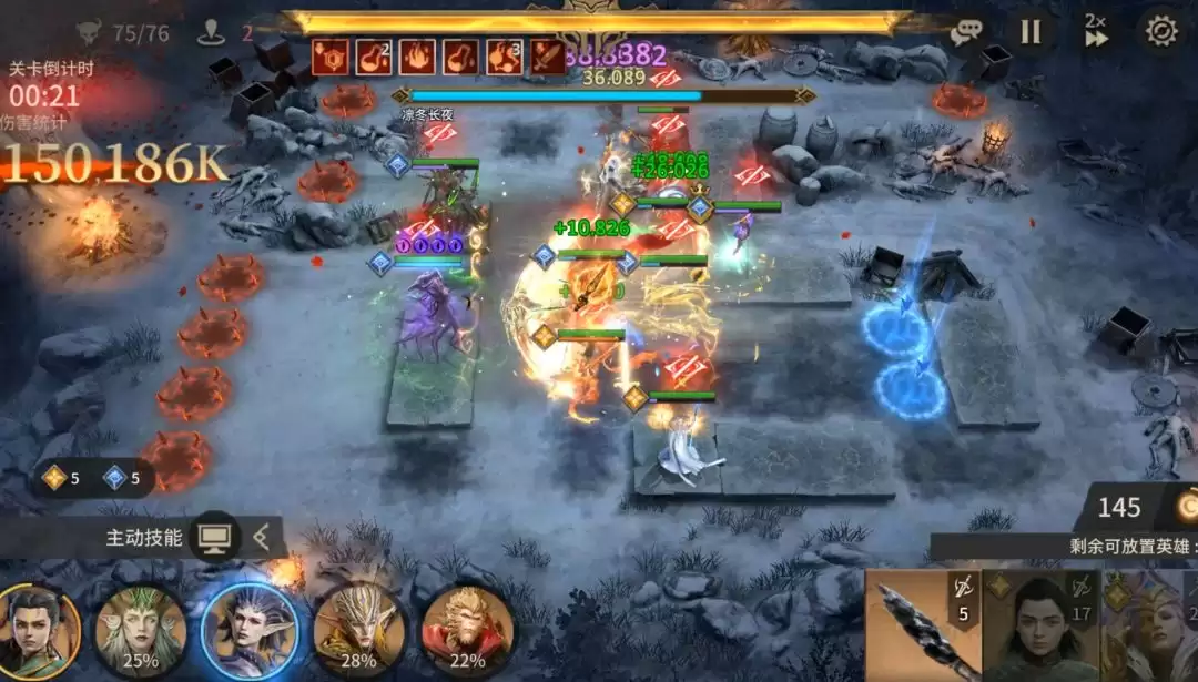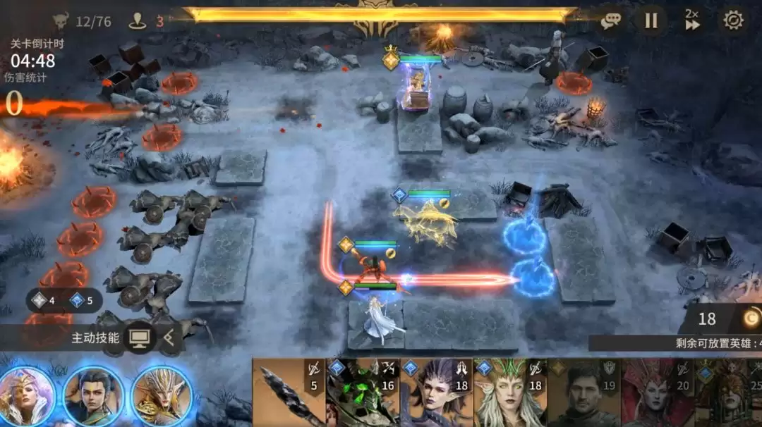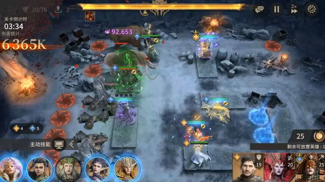 困难模式的BOSS不具备“凛冬长夜”这一机制,因此在输出英雄的选择上更为灵活,使用战士或射手类单体英雄均可造成可观伤害。需要注意的是,BOSS拥有一个特定技能:会投掷长矛攻击最后部署的那名英雄。因此,部署顺序至关重要——建议将核心输出与治疗英雄(能为自身及队友回复生命值的角色)安排在最后放置。