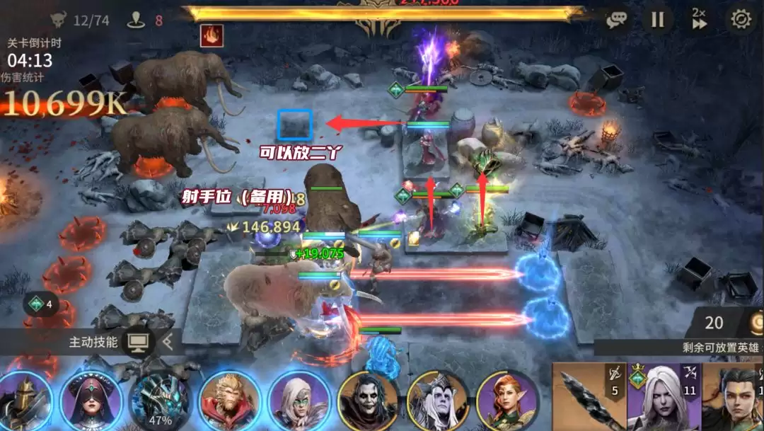 战场上的猛犸与骑士小怪伤害较高,若前排战士承压能力不足,可在阵线最前方提前部署一名守护者职业的英雄来专职吸收伤害。