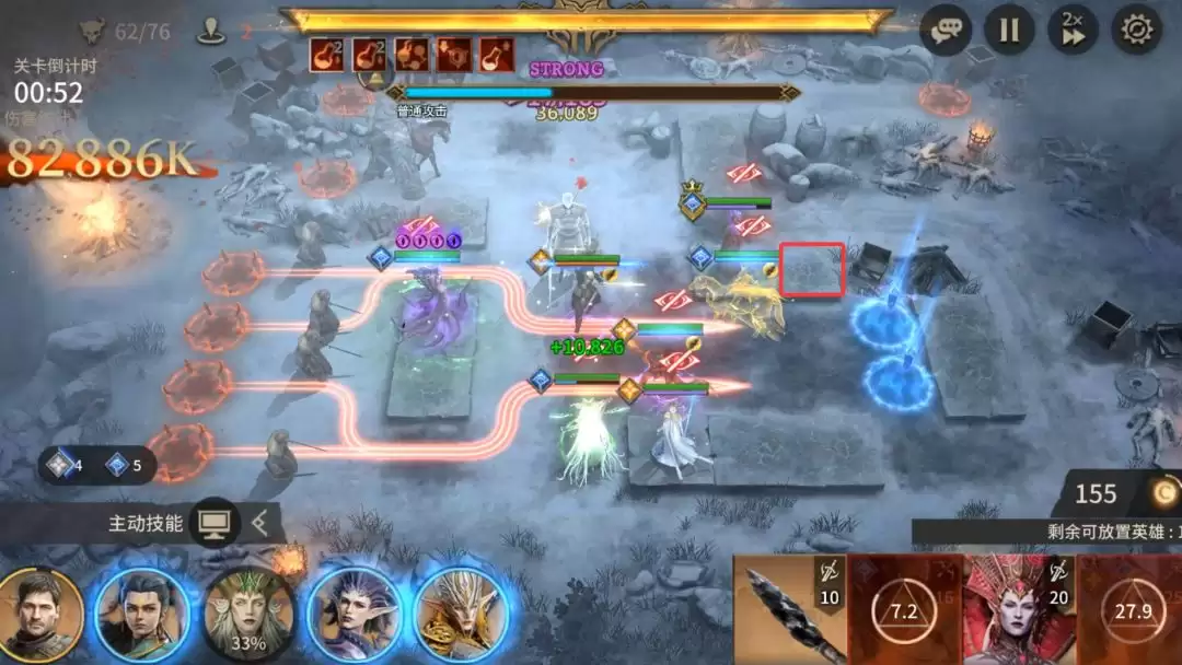3、部署詹姆(或其他可靠前排)抵挡BOSS,随后再次部署努梅拉,并在图示红框位置放下弗恩继续输出。没有艾莉亚的阵容,对努梅拉和弗恩的练度要求会稍高一些。另有一个“黑科技”英雄——泽娜,可以放置在努梅拉的位置,开启一次终结技后便撤回,然后再次部署并开启终结技,利用她每次上阵属性增强的机制来叠加伤害。