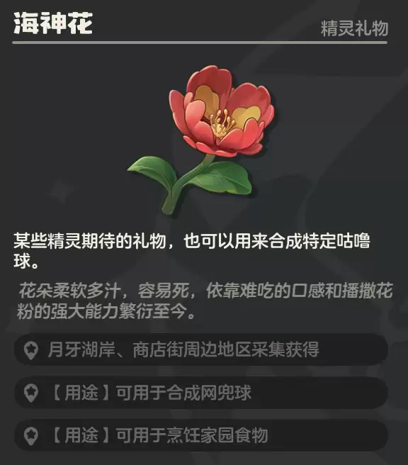 首先是海神花。这种花卉主要分布于月牙湖岸及商店街周边区域。采集后,它是合成重要道具“网兜球”的核心材料,同时在烹饪家园食物时也是常用素材,实用性与需求度都很高。
