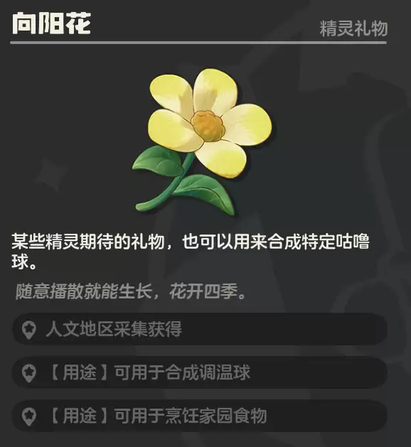 而向阳花则主要生长在人文地区。它的主要价值体现在合成“调温球”上,同时也是家园食物烹饪中不可或缺的原料之一。两种花朵功能各异,玩家可根据自身当前需求——无论是道具合成还是家园料理,前往对应的采集路线进行重点收集,从而实现资源获取的最优化。