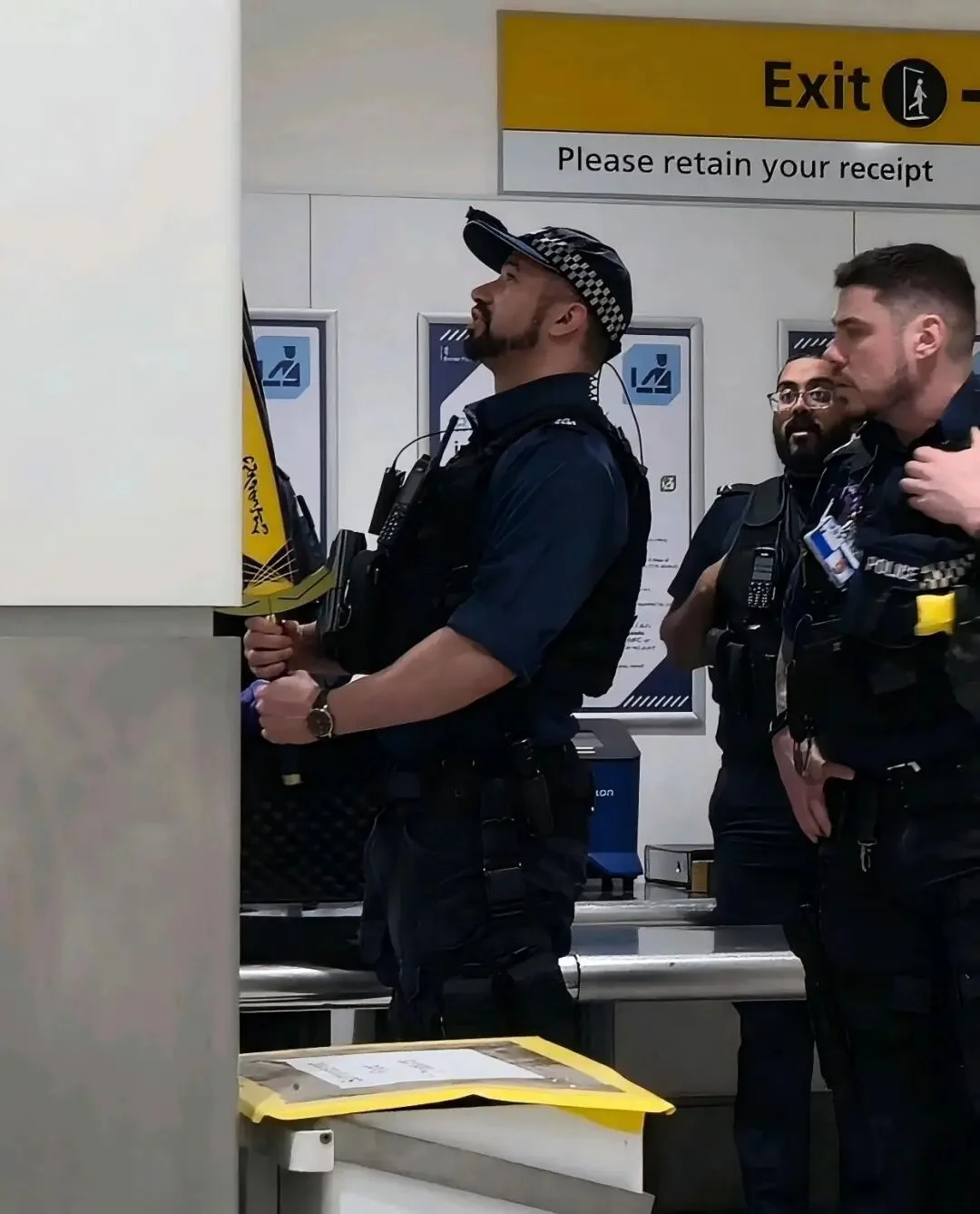 这张被他称为“历史性”的照片,确实记录下了一个充满戏剧性的画面:数名海关官员和警察围在一起,仔细端详着这把长剑,脸上交织着惊讶与不解的神情。