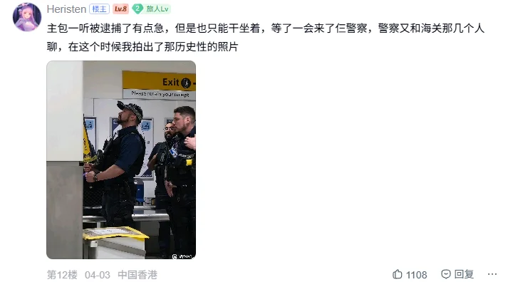 事后,当事人在贴吧详细描述了当时的场景。据他回忆,“听到行李被扣留时有点着急,但也只能等待。随后来了三位警察,他们与海关人员交谈。就在这个间隙,我拍下了那张具有历史意义的照片。”