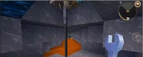 第一步:定位与勘察 首先,深入地下至岩浆层区域。找到岩浆湖后,可以尝试切换视角(例如潜入岩浆下方向上观察,或从侧面寻找),仔细搜寻镶嵌在岩浆岩壁或底部的蓝色矿石,如下图所示。