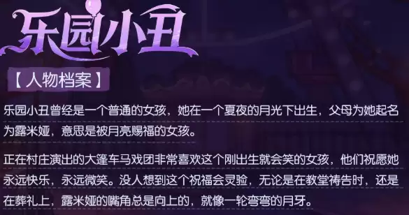 乐园小丑,本名露米娅,其名字寓意“月光下的祝福”。她在一个月华如练的夏夜诞生,父母期望她一生沐浴在月神的恩泽之中。然而,命运的馈赠往往伴随着意想不到的代价。