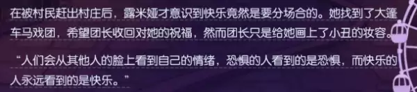被放逐后,露米娅找到了当年的马戏团。团长并未解除祝福,而是为她绘上小丑妆面,并点明:“他人脸上的表情,实则是观者内心的镜像。”心怀恐惧者,所见皆是威胁;内心光明者,所见皆是喜悦。这番话为她提供了全新的生存视角。自此,露米娅化身为“乐园小丑”,以永恒的月牙笑容面对世界,开始了她的巡演之旅。