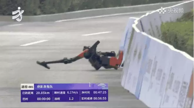 赛事中后段,画风逐渐多元。一些机器人开始“慢悠悠地晃着”,步伐仿佛喝了假酒,主打一个“健康完赛”。最揪心的一幕出现在冲线前:一台一路节奏稳定的机器人,在终点线近在咫尺时,突然“扑通”一声栽倒在地。