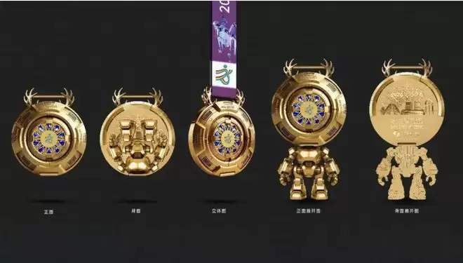 金属机甲风的设计基调,通体锻造质感,线条硬朗,结构错落。中间的巧妙之处在于可展开结构,拉开后,奖牌瞬间变身为一台立体的小型人形机器人。