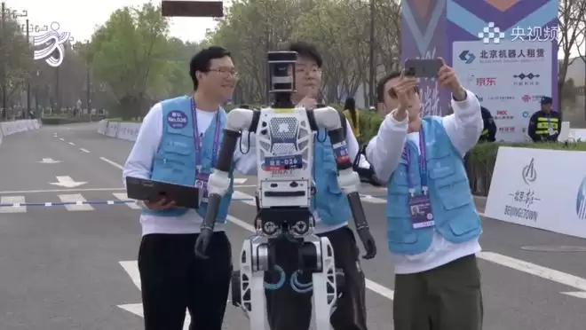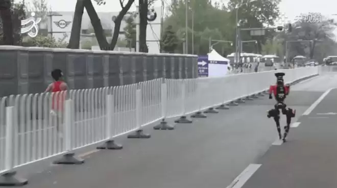 因此,赛程中段出现摔倒,几乎成了家常便饭。但也正是在这里,诞生了另一个经典画面:一位人类跑者正与机器人并肩竞速,机器人突然一个加速完成超越。人类选手侧目望去的那一刻,仿佛一幅关于未来竞速的“世界名画”。