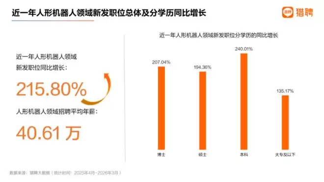 近日,猎聘大数据研究院推出了《2026机器人领域人才供需趋势洞察报告》。报告揭示了一个关键趋势:随着机器人产业的全面爆发,近一年来,人形机器人领域的新发职位同比暴涨215.80%,平均年薪高达40.61万元。