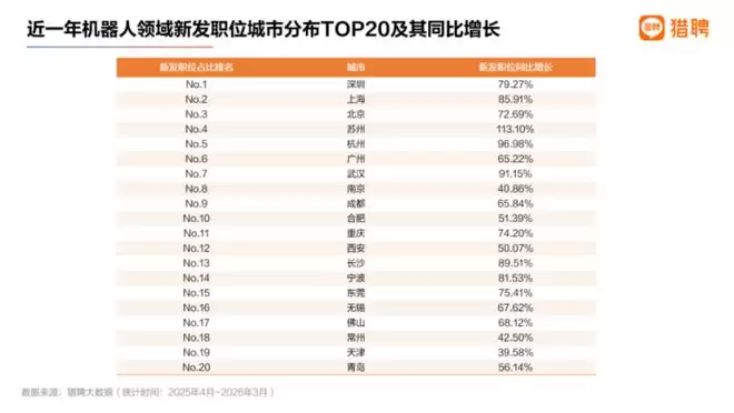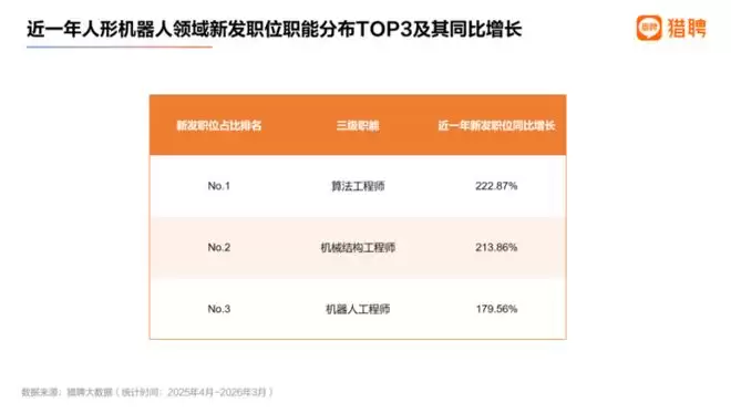 报告数据显示,近一年(2025年4月-2026年3月),整个机器人领域的新发职位同比增长达到75.26%,招聘平均年薪为32.80万元。