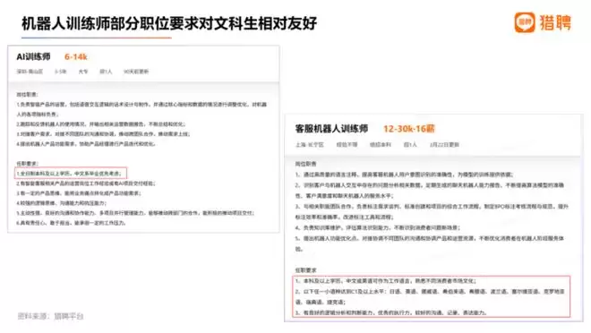 这类岗位既需要一定的技术理解能力,也高度依赖语言表达、用户洞察、多语言能力以及跨团队沟通协同。从相关能力要求图中可以看到,多语言要求、话术设计与沟通协同等内容占据重要位置,这为非技术背景人才提供了现实的切入机会。对于文科生而言,虽然并非所有机器人训练师岗位都适用,但在偏重内容、交互与运营导向的细分方向中,其在多语言能力、沟通表达、用户理解与内容结构化等方面的优势,依然有充分的发挥空间。