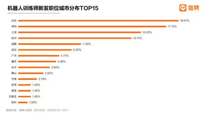 从城市分布来看,机器人训练师的人才需求高度集中于北京、深圳、上海和杭州,这四大城市合计占比达63.14%,构成了需求的核心圈,头部城市的集聚效应非常显著。
