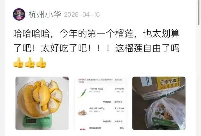 这两天,社交平台上已经有不少“榴莲脑袋”开始晒单了。比如橙友“杭州小华”就在橙柿互动APP上分享了自己在某电商平台的战果——一份“泰国鲜果托曼尼榴莲约3kg”。页面显示原价179元,算下来每斤不到30元,叠加优惠后价格更是诱人。看来,今年的榴莲季,已经带着一股“价格亲民”的气息悄然拉开了序幕。