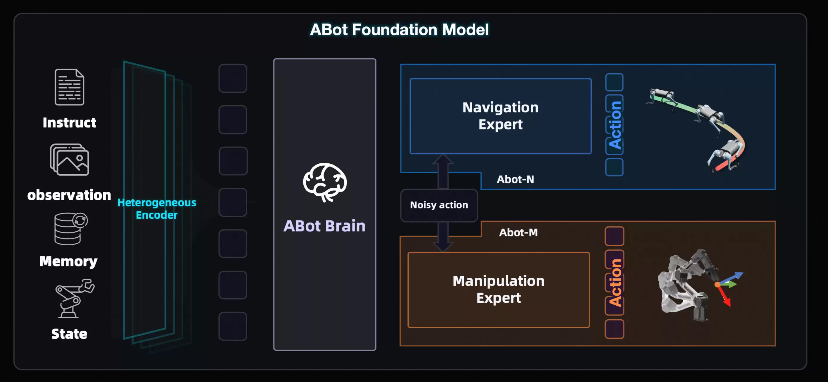 如果把ABot全栈体系视为具身智能的“运行大脑”,那么ABot-N与ABot-M便是其不可或缺的“运动双核”。它们分别掌管机器人的“双腿”与“双手”,直接响应物理世界中“去哪里”与“做什么”的基础指令。依托统一架构设计,高德打造出了可解耦又可协同的专用基座模型,一举突破了跨形态适配与跨任务泛化的技术瓶颈。