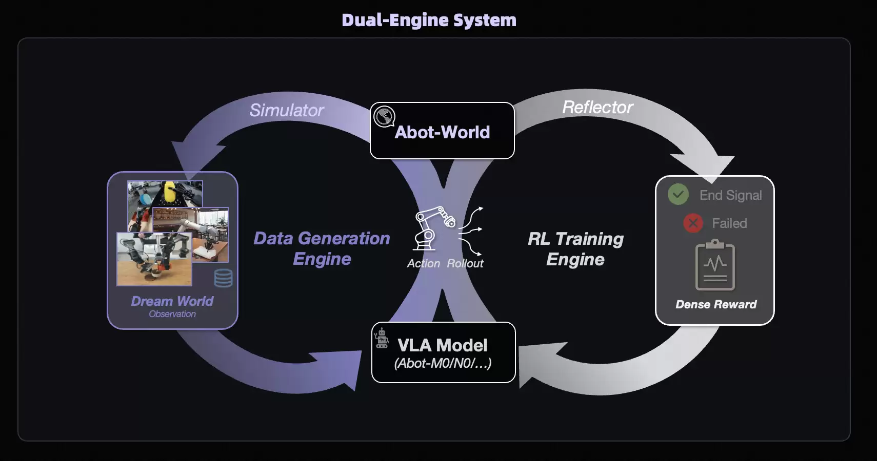 作为数据层的核心,ABot-World给出了答案。它通过批量合成视频、深度、点云、轨迹四类训练数据,配合强化学习训练引擎在虚拟环境中定义奖惩、反复试错。简单来说,就是用高保真仿真替代高昂的真机采集,从根本上弥合了仿真到现实的鸿沟,将数据成本压缩了数个数量级。