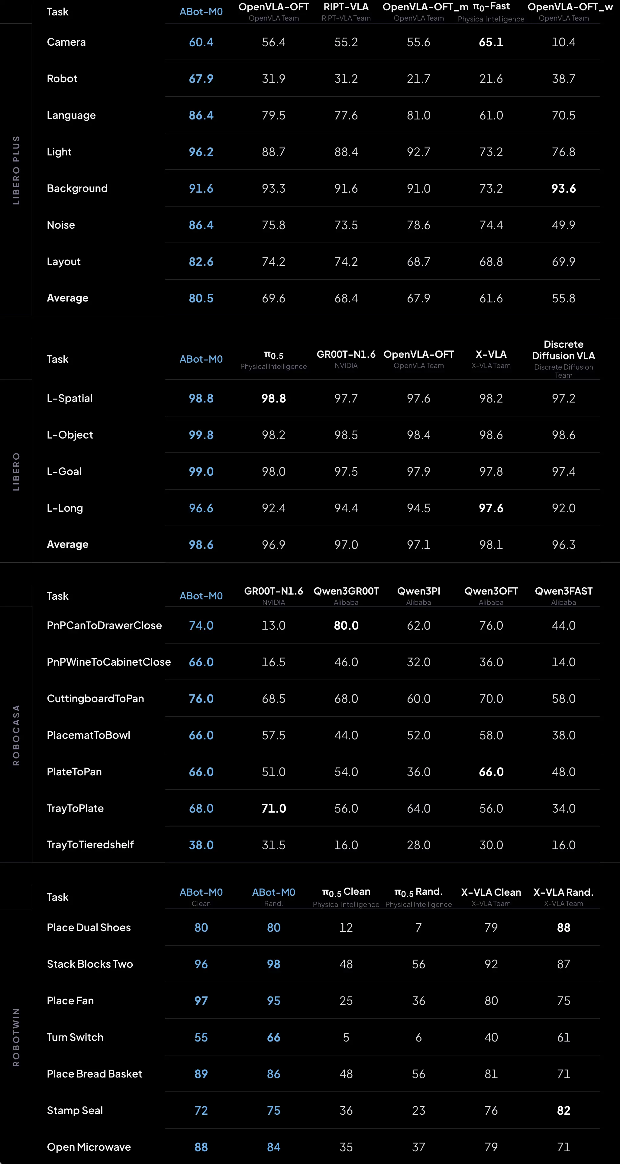 在LIBERO、LIBERO-Plus、RoboCasa GR1、RoboTwin 2.0等主流评测中,ABot-M全面超越了π0.5、UniVLA、OpenVLA-OFT等强基线,在泛化能力、鲁棒性与跨形态迁移三个维度实现了系统性领先。