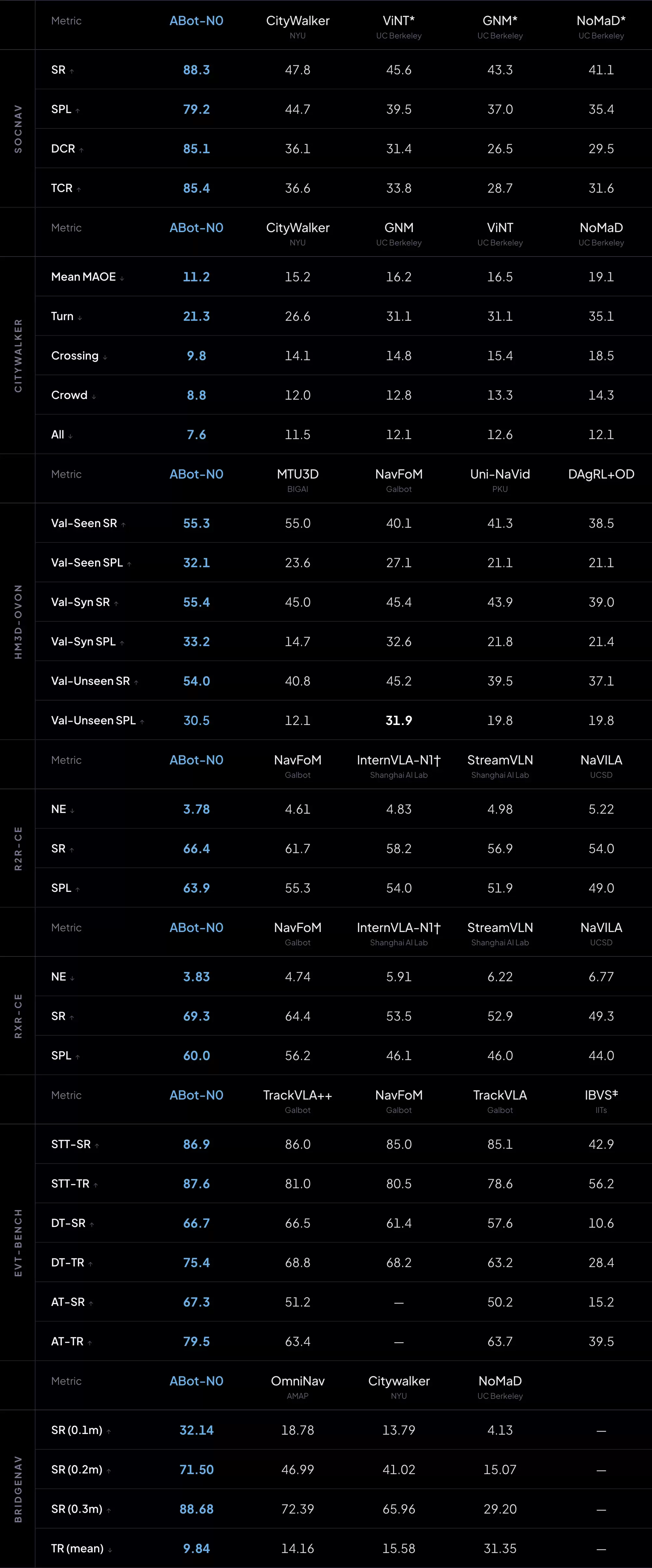 ABot-N推出后,迅速在VLN-CE(R2R/RxR)、HM3D-OVON、EVT-Bench等7大权威基准上全面刷新SOTA,并在导航精度、社会合规性、零样本泛化能力上实现了断层式领先。