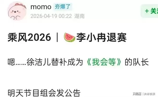 4月19日凌晨,一位IP地址显示为湖南的网友在社交媒体上爆料,称李小冉已从《乘风破浪的姐姐2026》中退出,其位置将由女艺人徐洁儿接替,并担任歌曲《我会等》表演组的队长。该爆料者进一步表示,节目组将在后续正式公布这一人员调整信息。