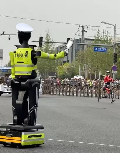 每当由各类人形机器人组成的方阵经过该路口时,“天轶”的手势与语音指令便精准传递,机器人跑者们依令有序左转;而一旁的人类选手则完全不受干扰,继续沿赛道正常通行。这种“人机分流、精准指挥”的场景,构成了此次赛事一道独特的风景线。