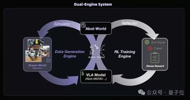 但这个飞轮不止于此。ABot-World并非静态模型,而是一个具备自我修正能力的认知基座——它能接入真实世界的执行反馈,让自己越用越准。具体而言,它支持完整的VLA(视觉-语言-动作)闭环:预测→执行→反馈→自我修正。例如,机器人根据推演去抓杯子,实际执行中若夹爪滑脱,这个误差信号会立刻回传,模型自动调整参数,下次预测便会更精准。