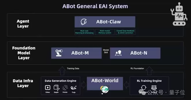 其架构清晰分为:数据层(ABot-World可交互世界模型)、模型层(导航基座模型ABot-N/执行基座模型ABot-M)、Agent层(机器人应用层操作系统ABot-Claw)。