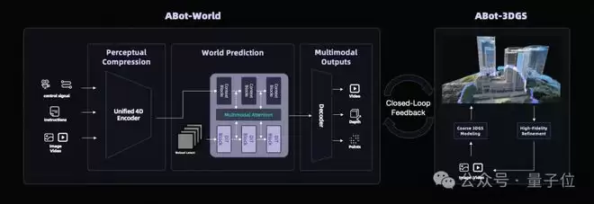 先从最直观的架构说起。ABot-World采用双引擎驱动:ABot-3DGS(物理世界的“数字孪生工厂”)和ABot-PhysWorld(因果推演的“物理思维引擎”)。初看可能以为是简单的“数据生成+模型训练”,但深入研究后会发现,这是一个完整的物理智能操作系统。
