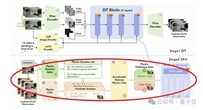 训练层面,高德摒弃了传统的MLE(最大似然估计,即优化像素相似度)方法,引入了“物理判别机制”。传统MLE只关心预测画面与真实画面的像素差异,不关心动作是否物理合理。为此,高德通过两个核心组件将优化目标从“像素像不像”转向“物理对不对”:Proposer模块根据任务列出物理规则清单;Scorer模块对模型生成的多个结果逐帧进行物理合规性打分。随后通过Diffusion-DPO(扩散模型直接偏好优化)技术强化合规行为——物理正确就奖励,物理错误就惩罚。经过反复纠正,模型便学会了“什么动作不违反物理定律”。