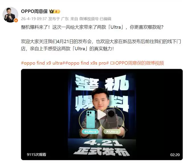 眼看荣耀与小米热度居高不下,友商自然也没有作壁上观。OPPO的副总裁周意保便亲自下场,提前透露了关于OPPO Find X9 Ultra与Find X9s Pro两款机型在影像方面的核心卖点。