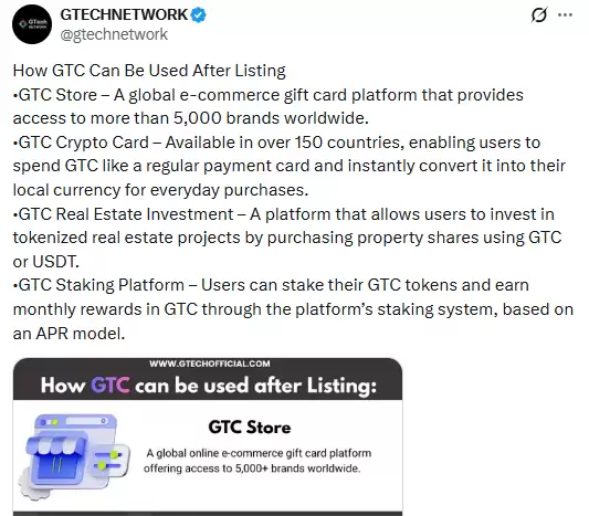 更关键的是GTC加密卡功能。该代币支持类似借记卡的使用方式,具备全球通用性,并能实现加密货币与法币的即时兑换。这个设计至关重要,要知道,大多数同类项目代币在上市初期,除了在交易所买卖,几乎找不到其他实际应用场景。GTech团队显然在努力,试图在代币正式进入公开市场前,就向外界展示其消费层面的价值。