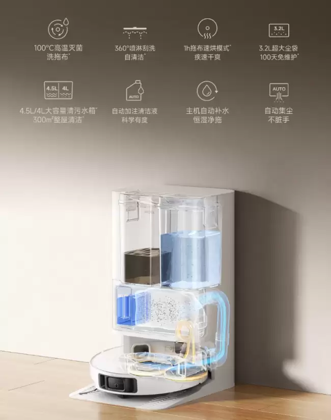 将60℃热水洗拖布升级为100℃高温灭菌洗,清洁除菌能力更上一层楼。