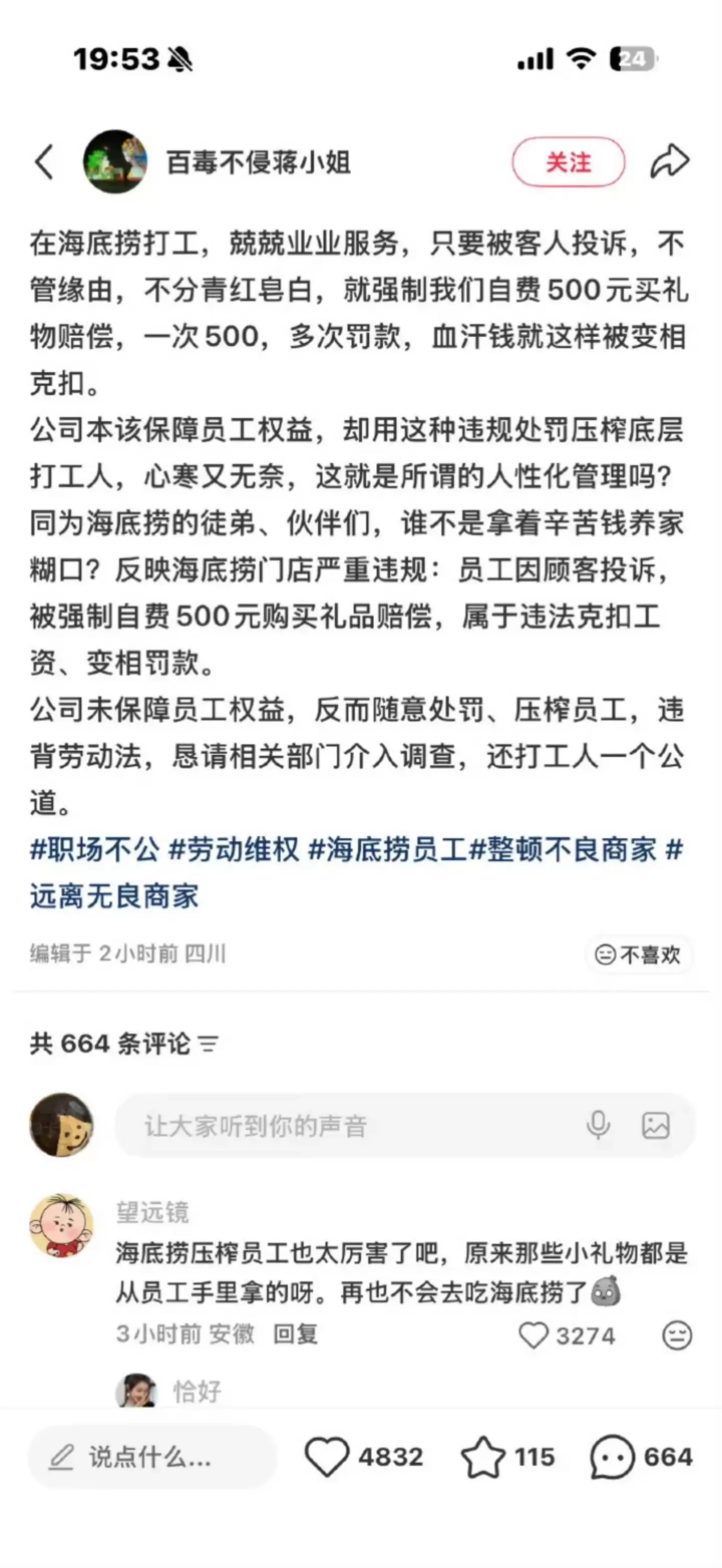 4月9日,一位在海底捞工作了六年的老员工发帖爆料:在北京某门店,只要遇到顾客投诉,无论缘由、不论对错,当事员工都得自掏腰包,拿出500元价值的礼物去赔礼道歉。据他所说,自己就曾三次被强制罚款,总额1500元。