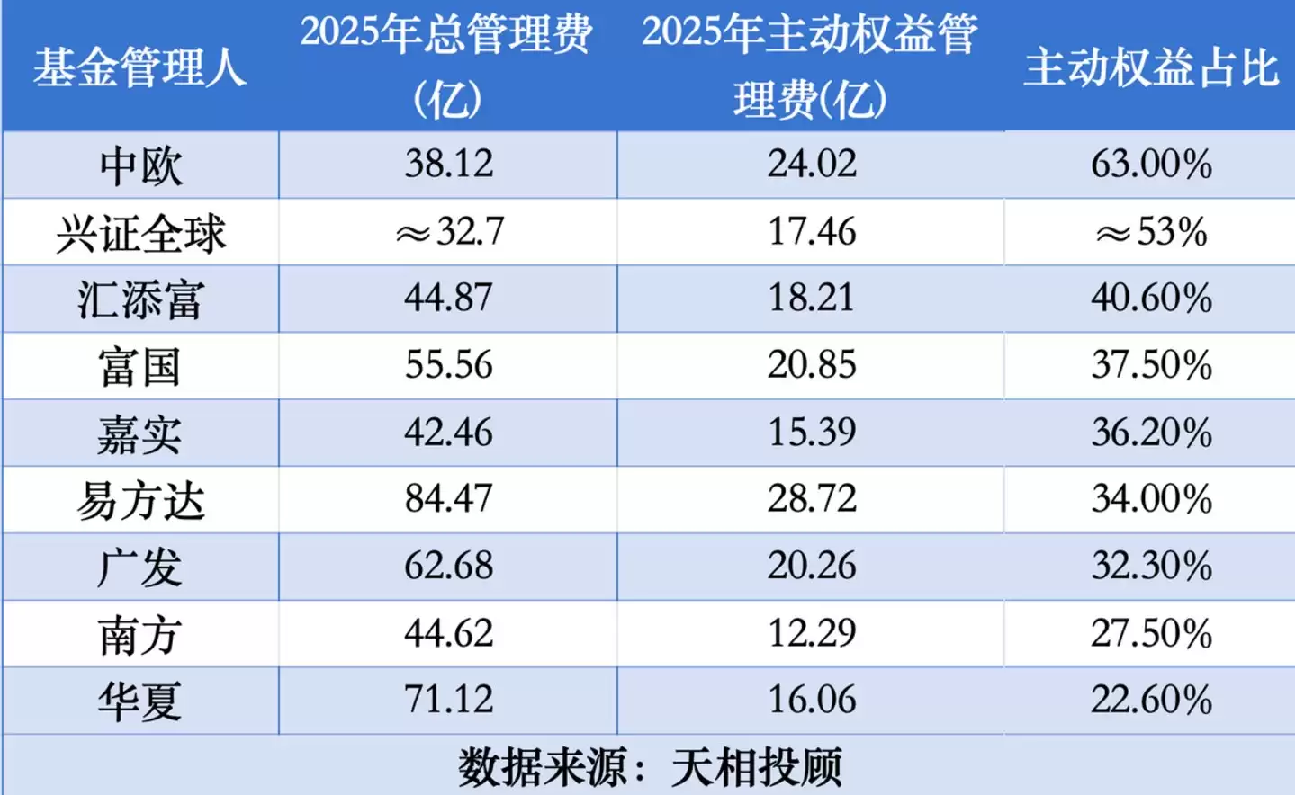 其中,中欧的依赖度最为突出。2025年,中欧总管理费为38.12亿元,其中24.02亿元来自主动权益,占比高达63%。兴证全球约为53%,在头部公司中仅次于中欧。对于这类公司而言,主动权益业务如同一把双刃剑:既是市场向好时利润弹性的主要来源,也是行情低迷时经营波动的直接放大器。