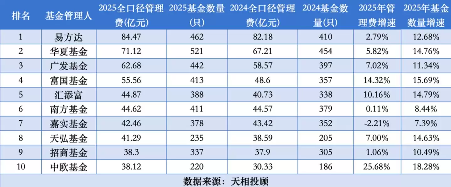 单看名次,这种变动算不上剧烈。但名次的稳定,绝不等于经营状态的稳定。真正值得玩味的,是管理费收入与产品扩张速度之间的背离。将管理费增速与基金数量增速放在一起对照,头部公司的分化路径远比榜单本身更为清晰。