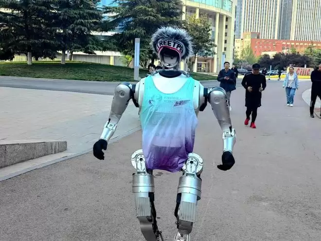 在山东济南高新区齐鲁软件园,人形机器人“行者泰山”正在进行高强度“特训”。这款由山东优宝特智能机器人有限公司研制的机器人,曾在“2025世界人形机器人运动会”100米表演赛中夺魁,因此吸引了不少“粉丝”前来伴跑,成了园区一景。