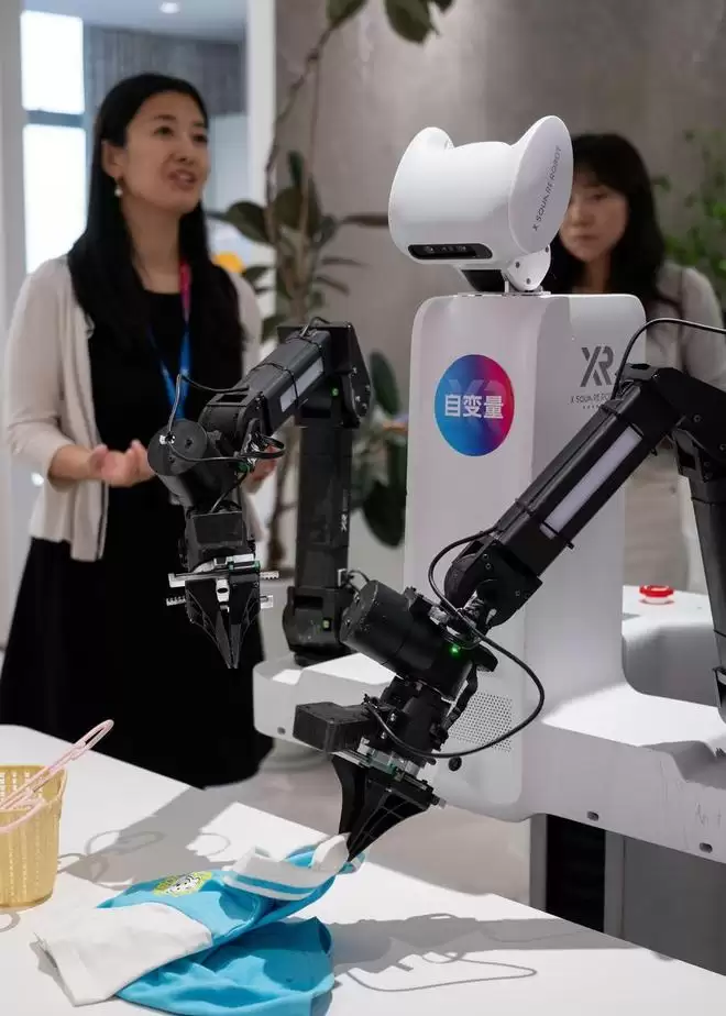 在深圳市南山区自变量机器人科技(深圳)有限公司,机器人执行整理衣服任务。新华社记者 刘梦琪 摄