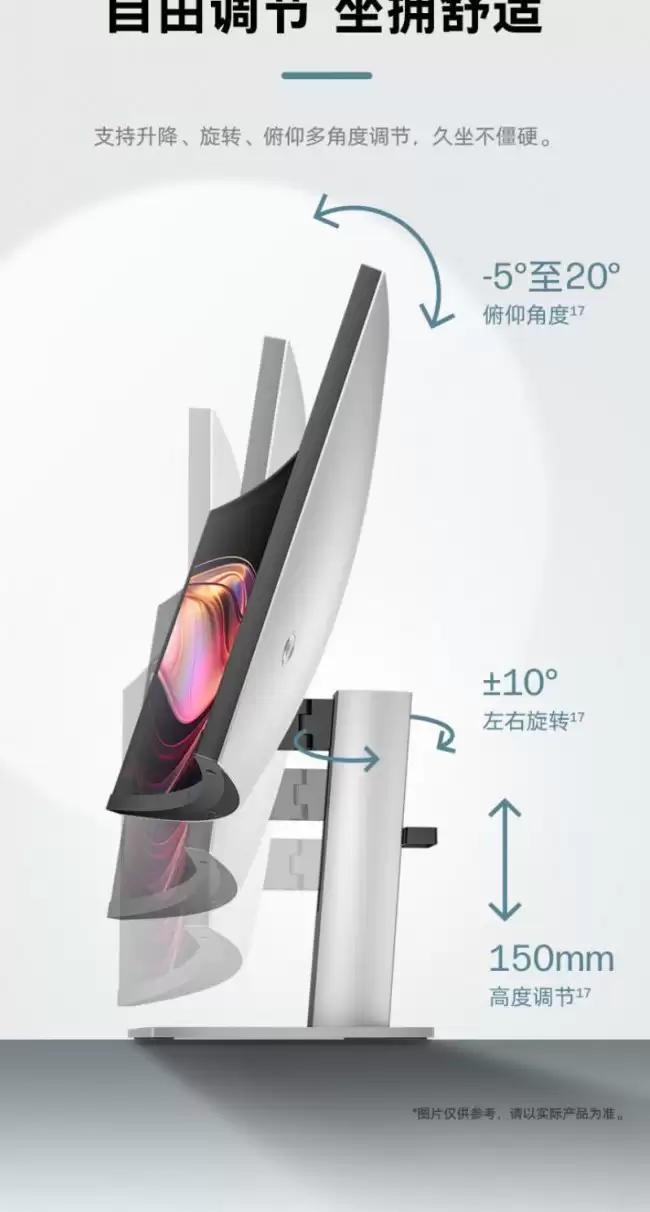 音效方面,内置了四扬声器系统,无需再外接音箱。人体工学设计也没落下,显示器支架支持升降、旋转和俯仰调节,方便用户找到最舒适的观看姿势。