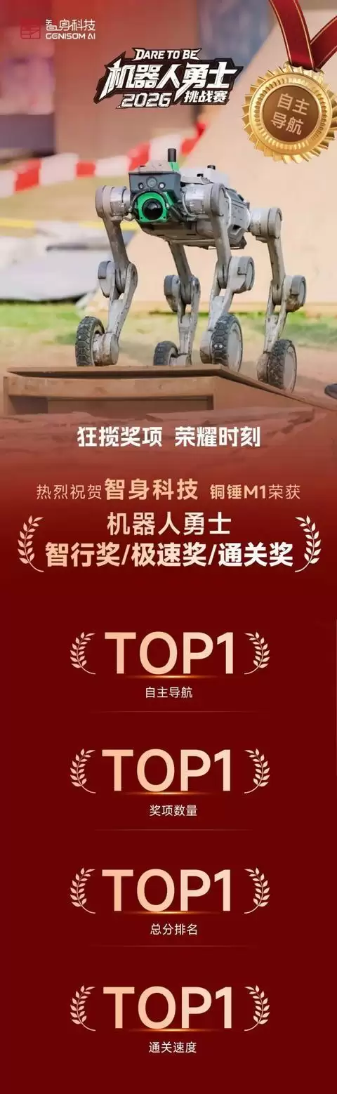 在这场高手云集的竞技中,商业化领先企业智身科技(GENISOM AI)的表现尤为抢眼。他们以人形机器人“破风者RX”和四足机器人“铜锤”系列双阵容出征。更值得一提的是,智身科技是唯一一支参与了勇士挑战赛全部三项赛事的队伍。其旗下的铜锤M1机器人,一举狂揽机器人勇士智行奖、通关奖、极速奖等六个奖项,在四足机器人大类中,实现了自主导航、奖项总数、总分、速度四个维度的“第一”。