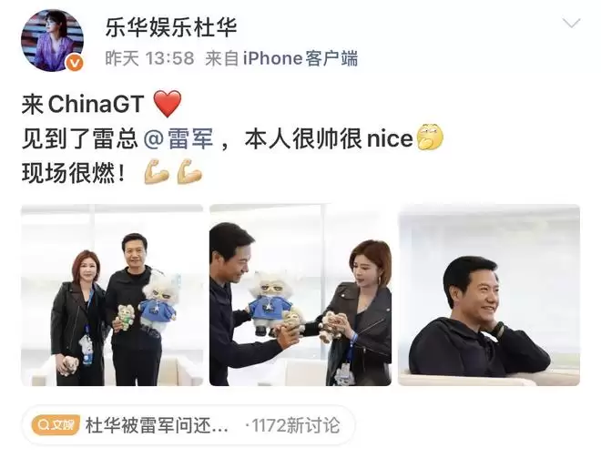 近日,乐华娱乐创始人兼CEO杜华惊喜亮相China GT中国超级跑车锦标赛现场。她在个人社交媒体账号上主动分享了一张与小米集团创始人雷军的同框合影,并配文称赞道:“雷总本人很帅很nice,现场氛围非常燃。”
