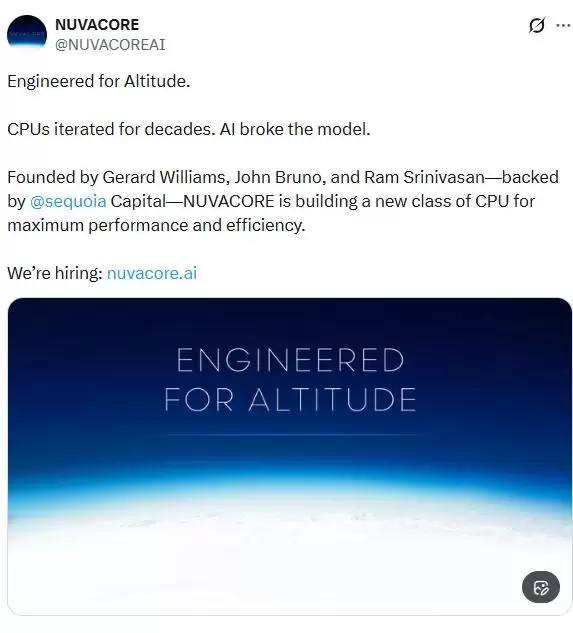 所以,创业几乎是板上钉钉的事,唯一的悬念是:创什么?上一次,他在Nuvia打造的Phoenix芯片瞄准了数据中心市场,圆了自己设计顶级服务器芯片的梦(此前他主导的多是消费级处理器)。那么,NUVACORE的方向是什么?答案就在其官方推特的第一个帖子里——AI芯片。推文还附上了一句话:“CPU已经迭代发展了几十年,但是AI已经彻底改变了这个行业。”