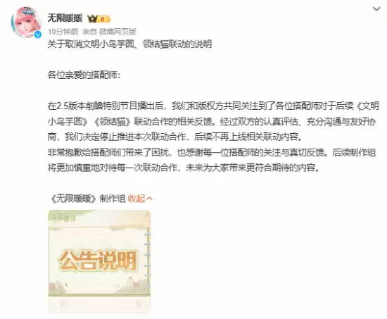 “在2.5版本前瞻特别节目播出后,我们与版权方共同关注到了各位搭配师对于后续《文明小鸟芋圆》《领结猫》联动合作的相关反馈。经过双方的认真评估、充分沟通与友好协商,我们决定停止推进本次联动合作,后续不再上线相关联动内容。
