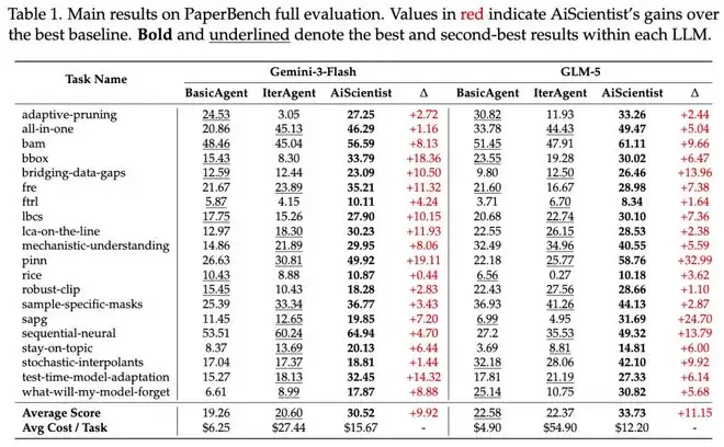 换句话说,AiScientist并不试图让某一个智能体把所有细节都「记在脑子里」,而是让不同角色围绕一个持续更新的项目状态展开协作。顶层控制保持轻量,底层状态保持厚实,系统因此可以在长程任务中逐步积累,而不是反复从头开始。