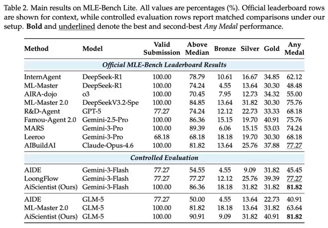 在MLE-Bench Lite上,AiScientist达到了81.82%的“任意奖牌”率,说明它不只擅长「把系统先跑起来」,也能在更接近真实竞赛和研究迭代的场景中持续优化结果。