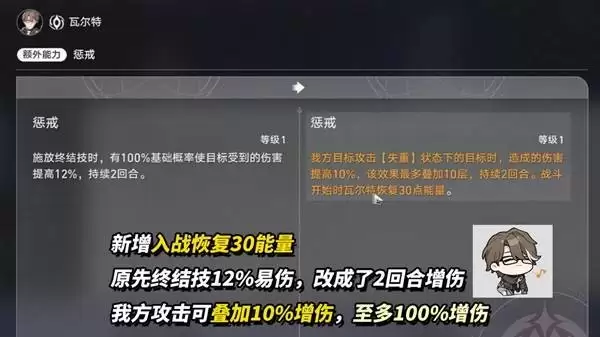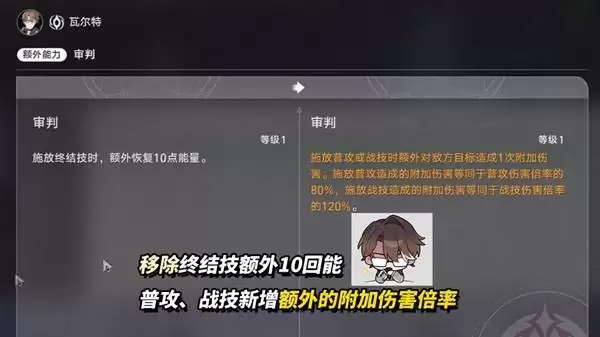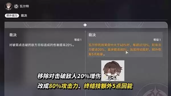 【额外能力·裁决】同步迎来重做。旧版“对弱点击破敌人造成20%额外伤害”的效果被替换为:施放终结技时额外回复5点能量;当瓦尔特的效果命中达到80%时,将额外获得80%攻击力加成。