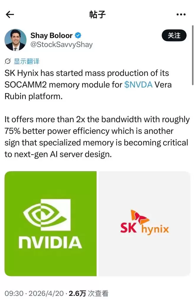近期,半导体行业传来重要进展。4月20日,据美国知名市场策略师Shay Boloor透露,SK海力士已正式启动面向英伟达Vera Rubin平台的SOCAMM2内存模块的大规模量产。这款新型内存模块性能表现卓越,不仅实现了带宽翻倍以上的显著提升,更将功耗效率优化了约75%。这一突破清晰地表明,专用内存解决方案正成为塑造下一代AI服务器核心性能的关键组成部分。