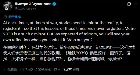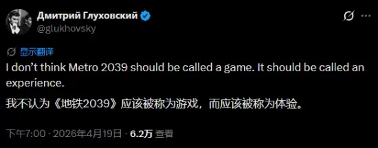 然而,近期系列原作者的一番表态,为这份期待增添了更深层的意涵。据Insider Gaming报道,小说原作者德米特里·格鲁霍夫斯基在社交媒体上明确表示,玩家或许不应简单地将《地铁2039》视为一款游戏。他直言:“我不认为《地铁2039》应该被称为一款游戏,它更应该被称为一种体验。”