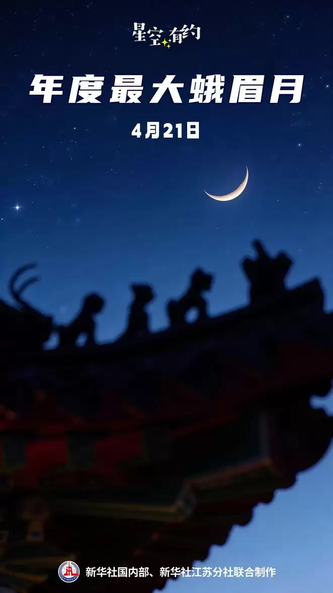 如果天气晴朗,4月21日傍晚时分,公众将有机会在西方低空欣赏到一轮极为特别的蛾眉月。这不仅是今年视直径最大、最明亮的一弯新月蛾眉月,还可能伴随“新月抱旧月”的唯美天文现象,为春日黄昏的天幕增添一抹动人的景致。