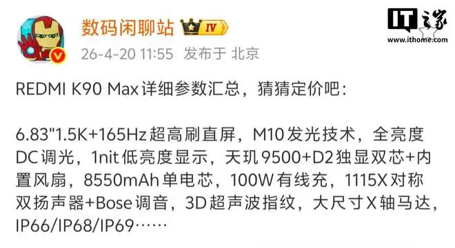 小米 Redmi K90 Max 详细参数汇总:内置风扇、天玑9500双芯与8550mAh大电池