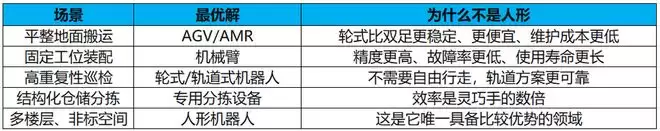 聚焦到具体的落地场景,如果行业始终停留在前三类订单,那么人形机器人将永远困在“展览经济”里。要真正进入生产型场景,就必须回答一个更本质的问题:为什么很多明明需要自动化的工业任务,偏偏不需要“人形”?